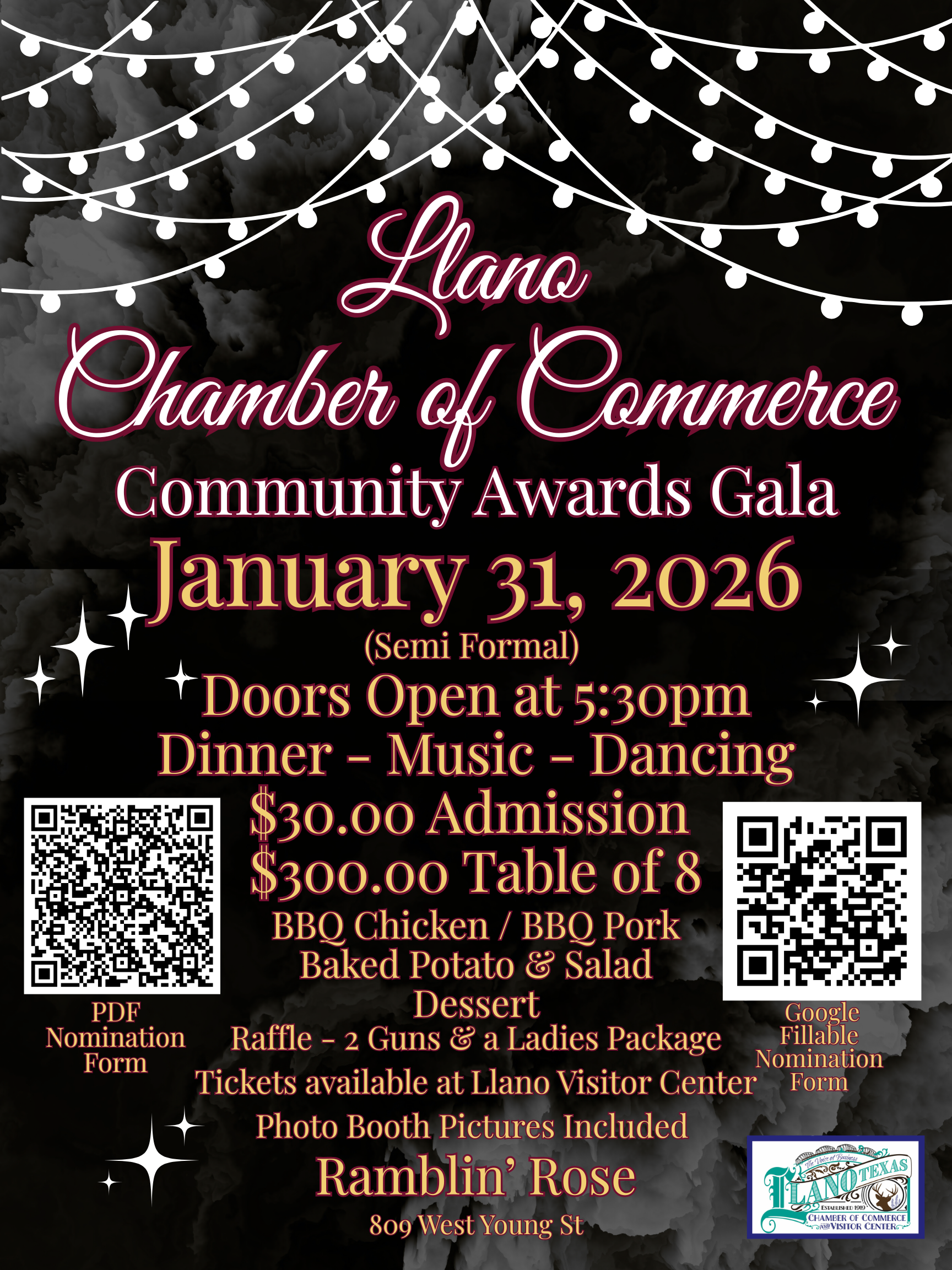 The Chamber of Commerce Banquet is scheduled for January 31, 2026. The nomination deadline to January 16, 2026. Please submit your nominations at the Llano Visitor Center / Llano Chamber of Commerce located at 100 Train Station Drive, Llano. You can also email them to Llanochamberinfo@llanochamber.org or hand them directly to Tony or any board member.