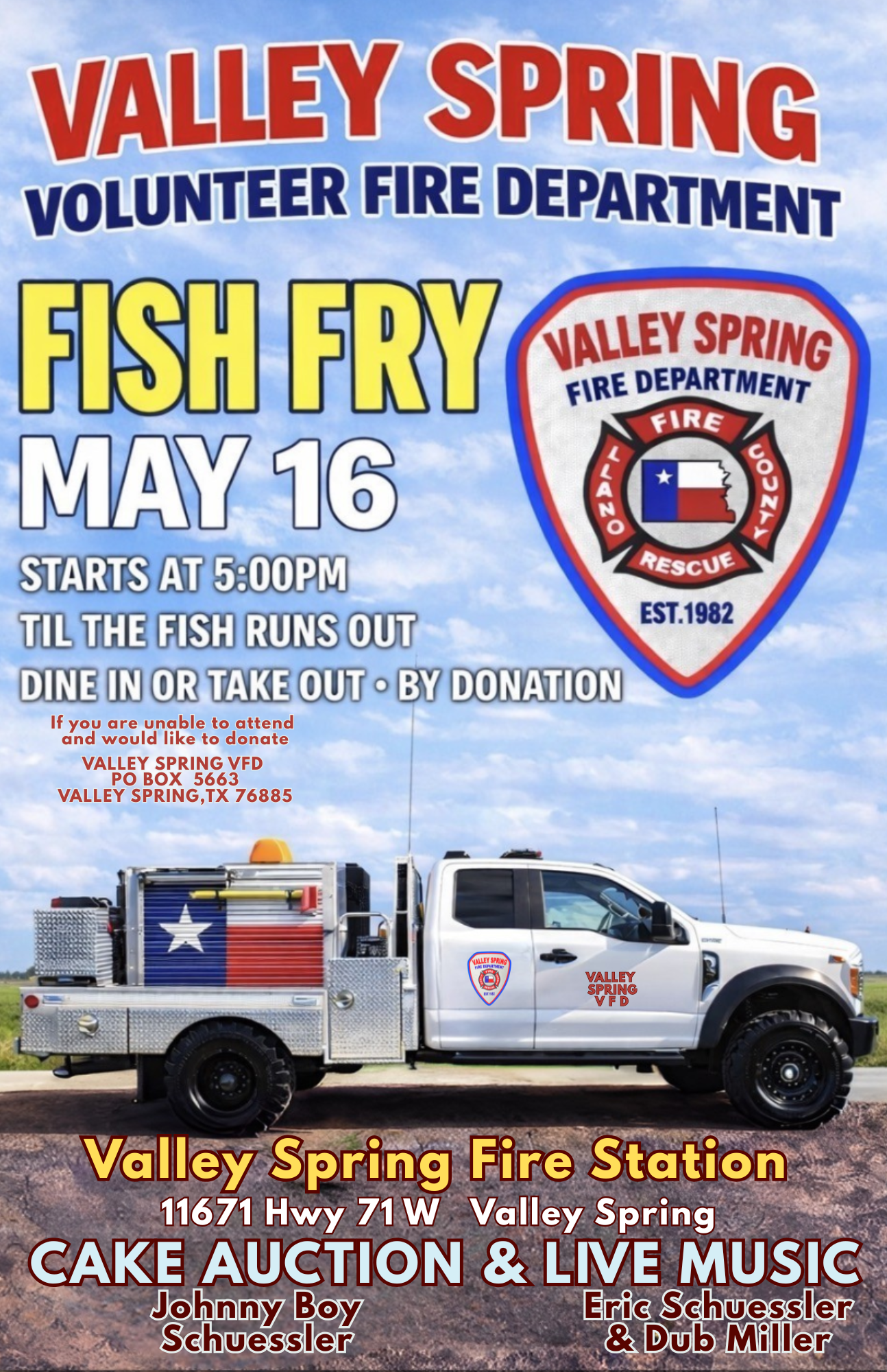 Save the Date! VALLEY SPRING VFD FISH FRY SATURDAY, MAY 17th VALLEY SPRING FIRE STATION