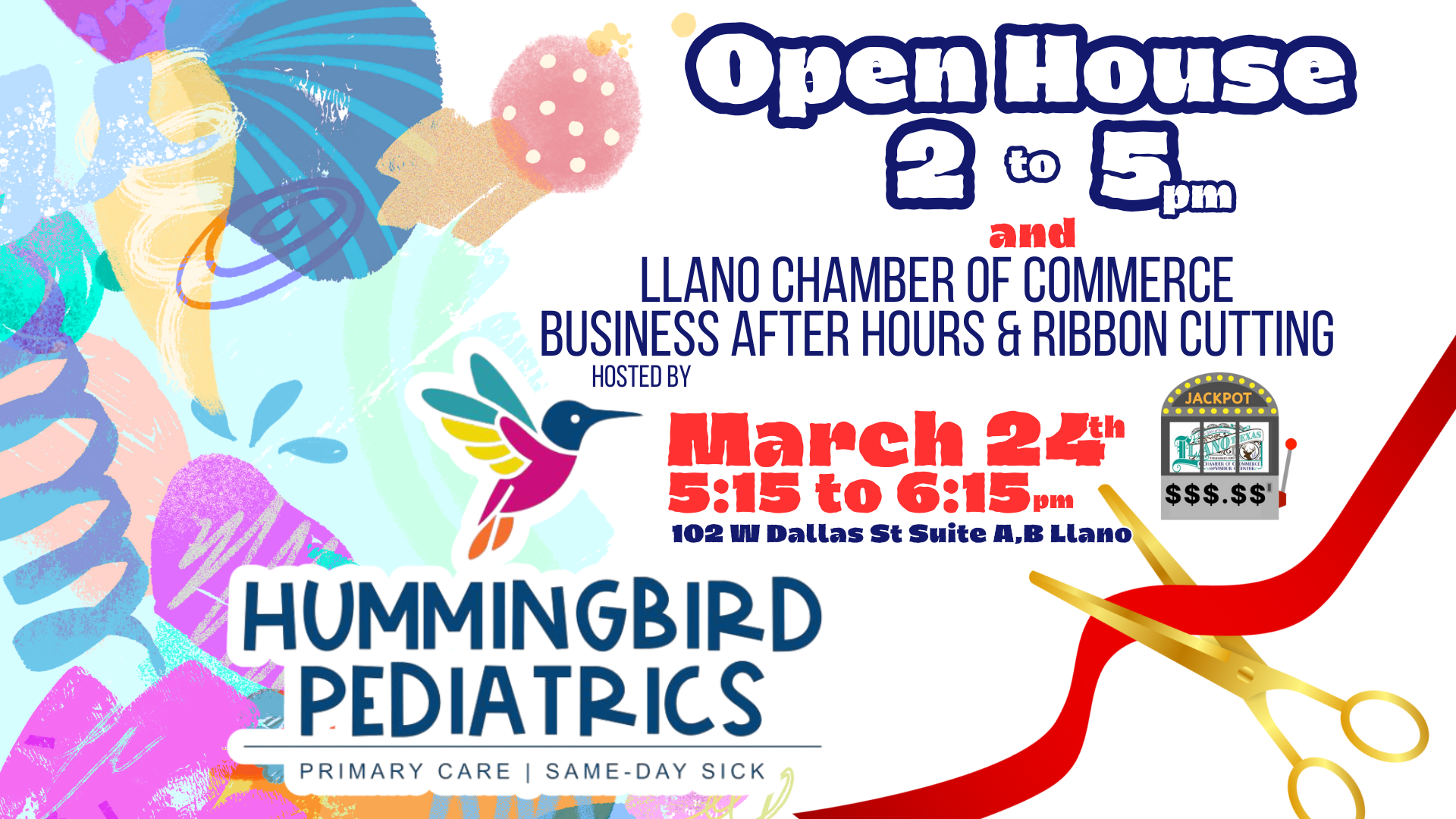 Everyone is warmly invited to the Business After Hours and ribbon-cutting ceremony for Hummingbird Pediatrics, located at **102 W Dallas St in Llano**. Join us on **March 24** from **5:15 to 6:15 PM**.