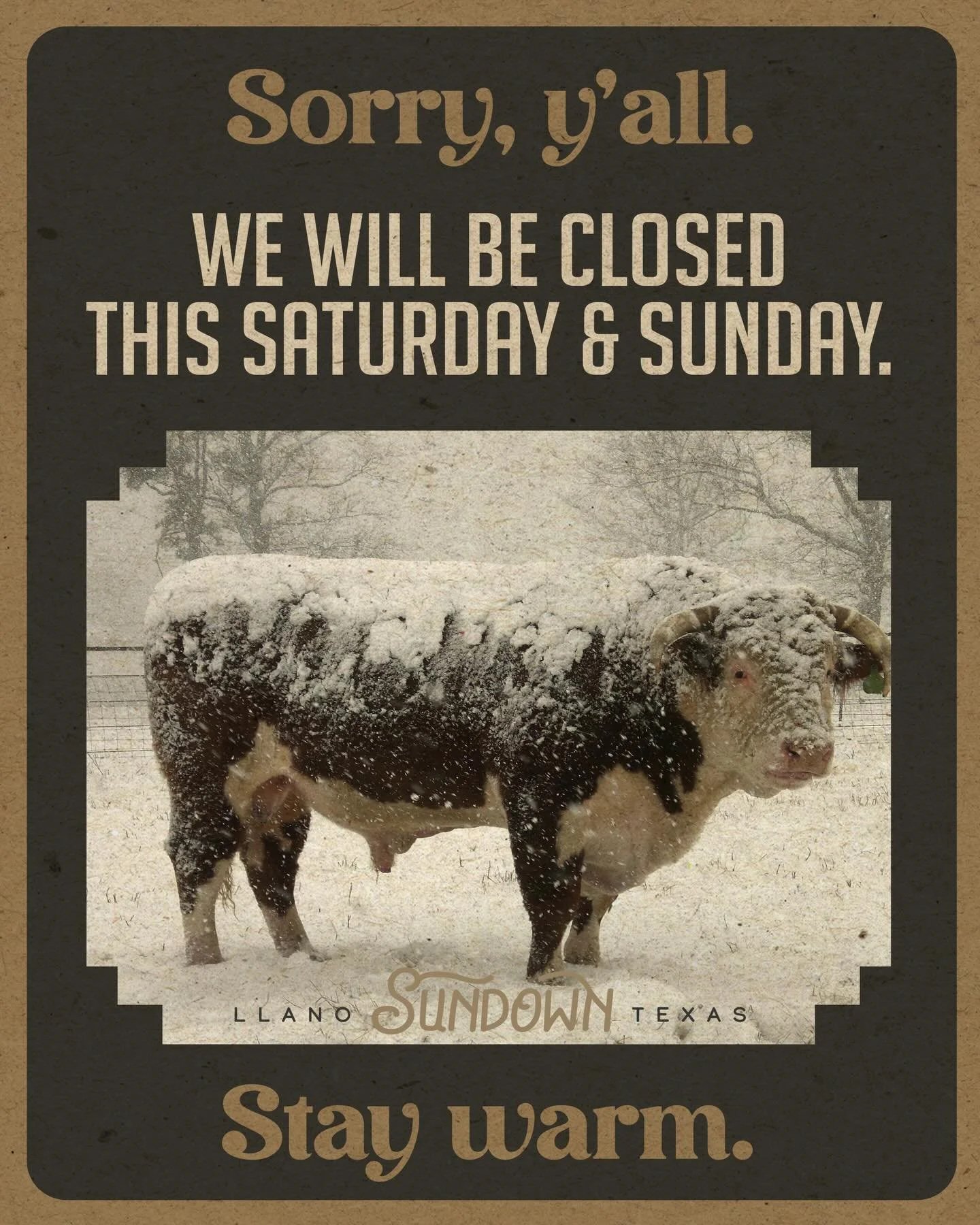 We’ve been monitoring the weather hoping that the cold front would stall a day or two, but it’s not looking good. So, we have decided to be closed this Saturday and Sunday, meaning that Chicken Shhh! Bingo will not be happening this month. But, come out on Friday night for your one chance to honky tonk this weekend with our band, The Lonesome Fugitives. Y’all be safe and warm out there.