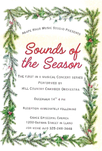 Agape Haus Music Studio presents Sunday, December 14, 2025 4:00 PM 6:00 PM Grace Episcopal Church 1200 Oatman Street Llano, TX, 78643 United States (map) Google Calendar ICS Agape Haus Music Studio