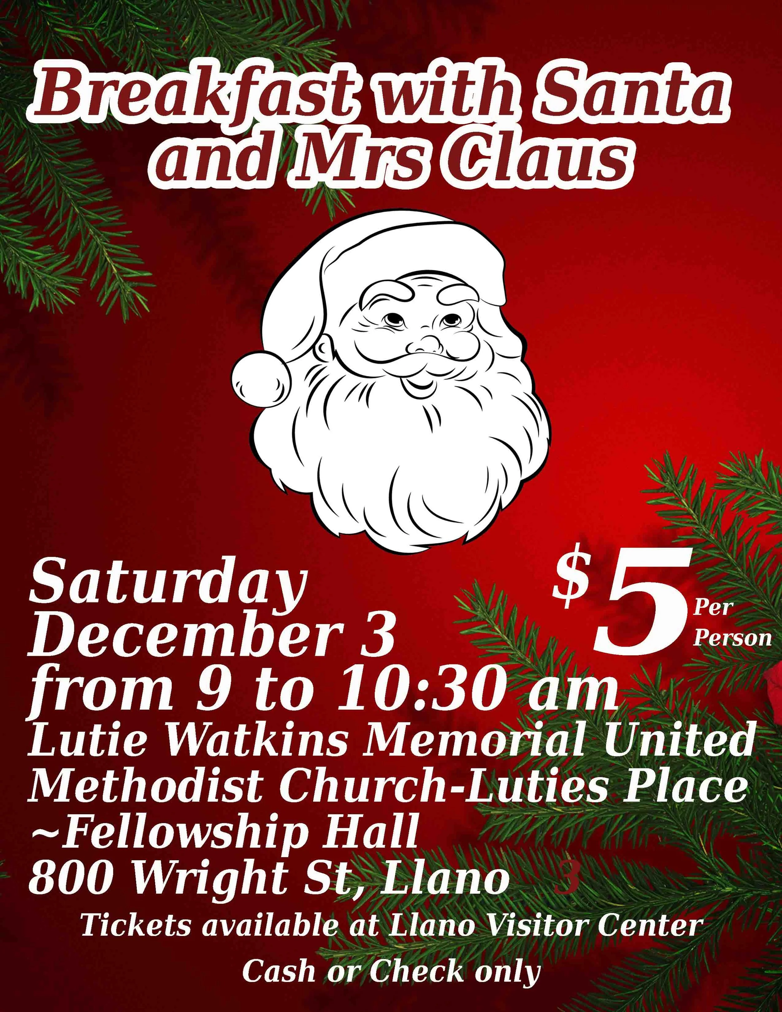 Back to All Events Breakfast with Santa & Mrs Claus Saturday, December 3, 2022 9:00 AM 10:30 AM Luties Place - United Methodist Church 800 Wright Street Llano, TX, 78643 United States (map) Google Calendar ICS