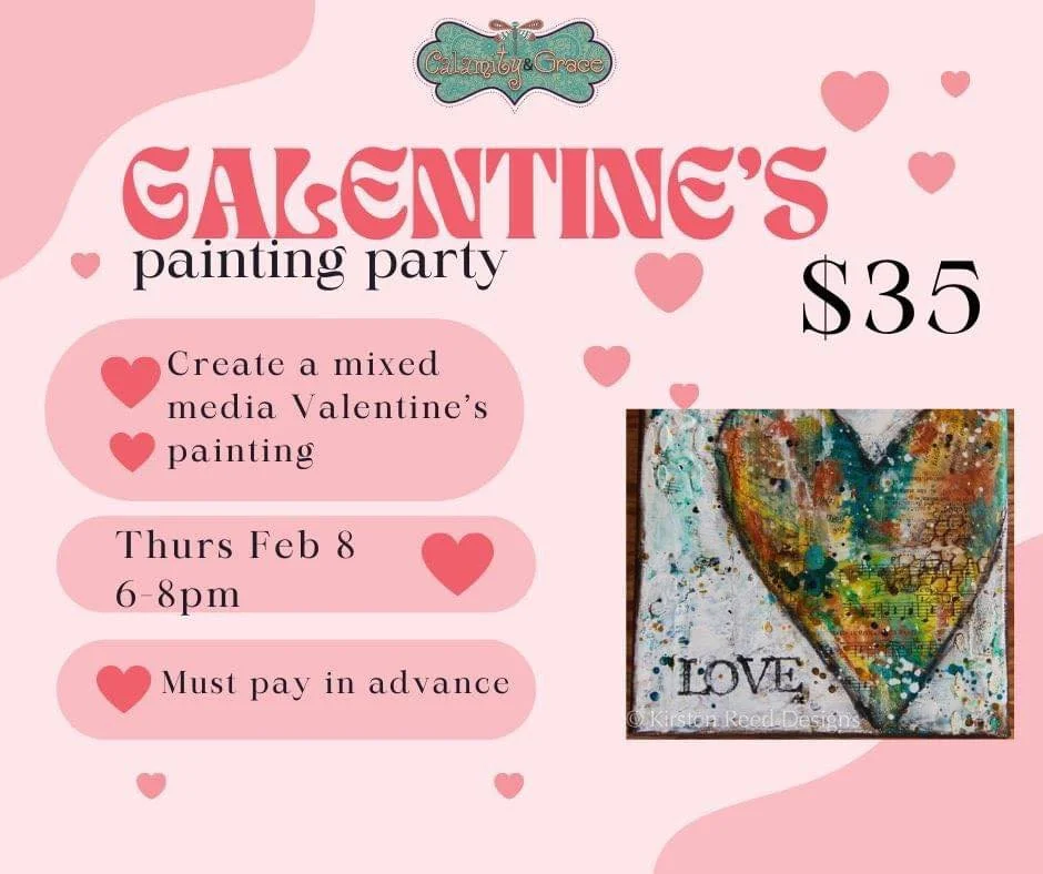 Calamity & Grace Galentine’s Painting Party Friday, February 16, 2024 6:00 PM 8:00 PM Calamity & Grace 803 Berry St. Llano, TX, 78643 United States (map) Google Calendar ICS Create a beautiful mixed media heart painting! You will be using paint, paper and stencils to create a colorful printing to take home! Great gal’s night out! BYOB, light refreshments will be available! Come in and create! Only $35