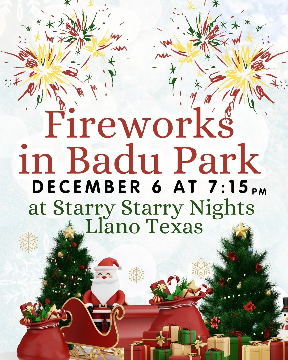 Back to All Events Fireworks at Starry Starry Nights in Llano at Badu Park Saturday, December 6, 2025 7:15 PM 8:15 PM Badu Park 300 Legion Dr 78643 US (map) Google Calendar ICS