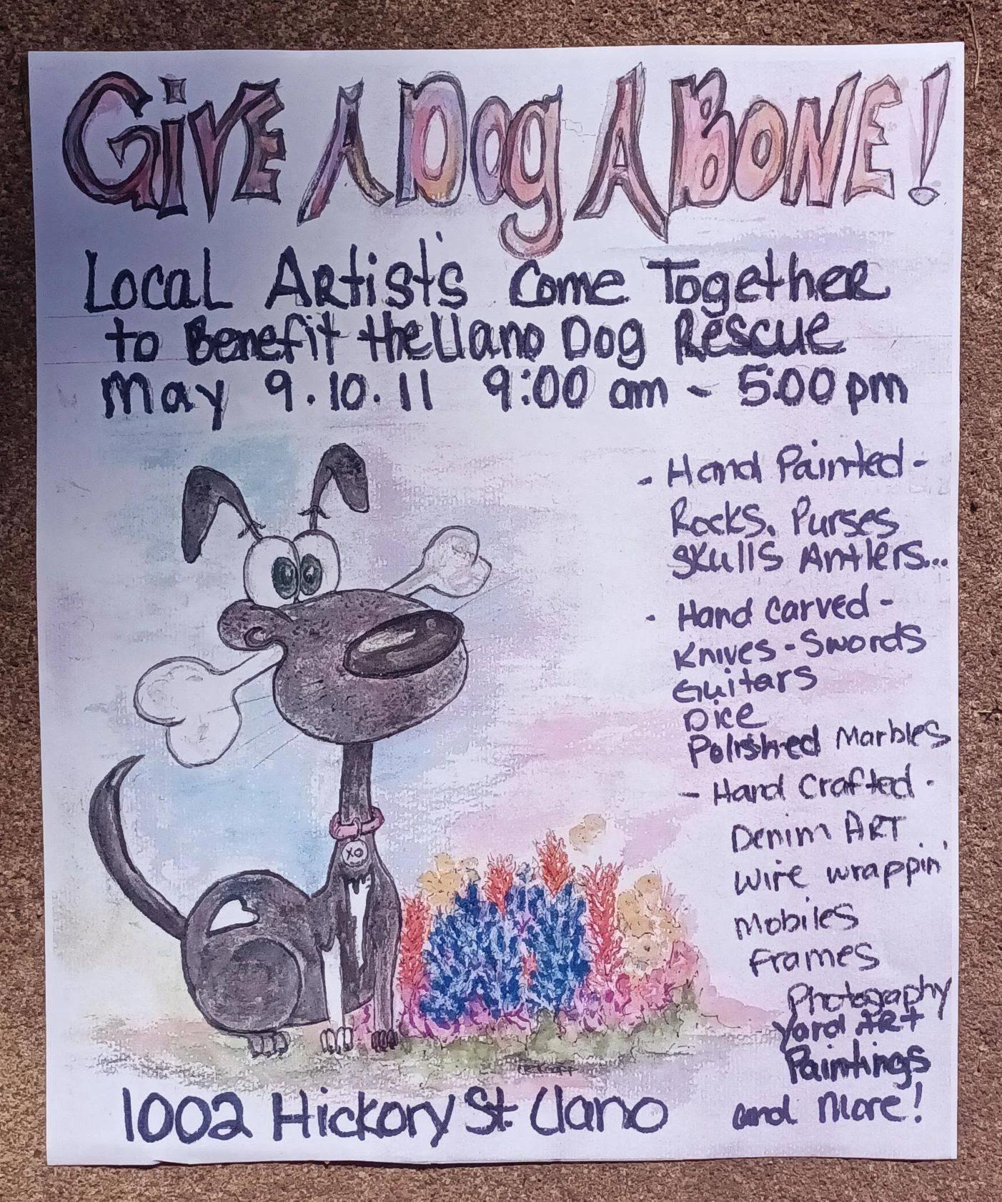 Give a Dog a Bone! Fundraiser by Local Artists Benefiting Llano Animal Rescue Friday, May 9, 2025 9:00 AM Sunday, May 11, 2025 5:00 PM 1002 Hickory Street Llano, TX, 78643 United States (map) Google Calendar ICS
