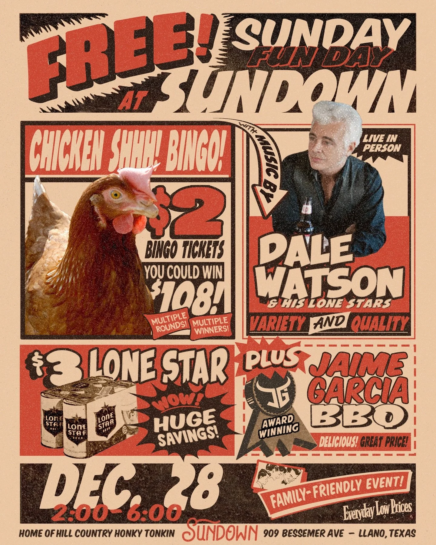 Chicken Shhh! Bingo at Sundown Hosted by Dale Watson Sunday, December 28, 2025 2:00 PM 6:00 PM Sundown Llano 909 Bessemer Avenue Llano, TX, 78643 United States (map) Google Calendar ICS Sundown Llano