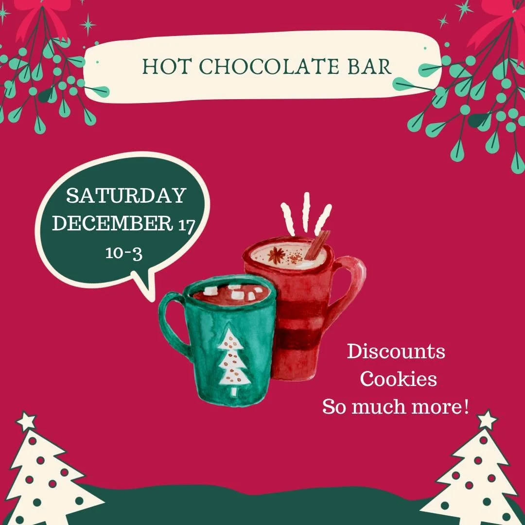 This Saturday we will have a hot chocolate bar with lots of goodies! Discounts for your last minute Christmas shopping and more!