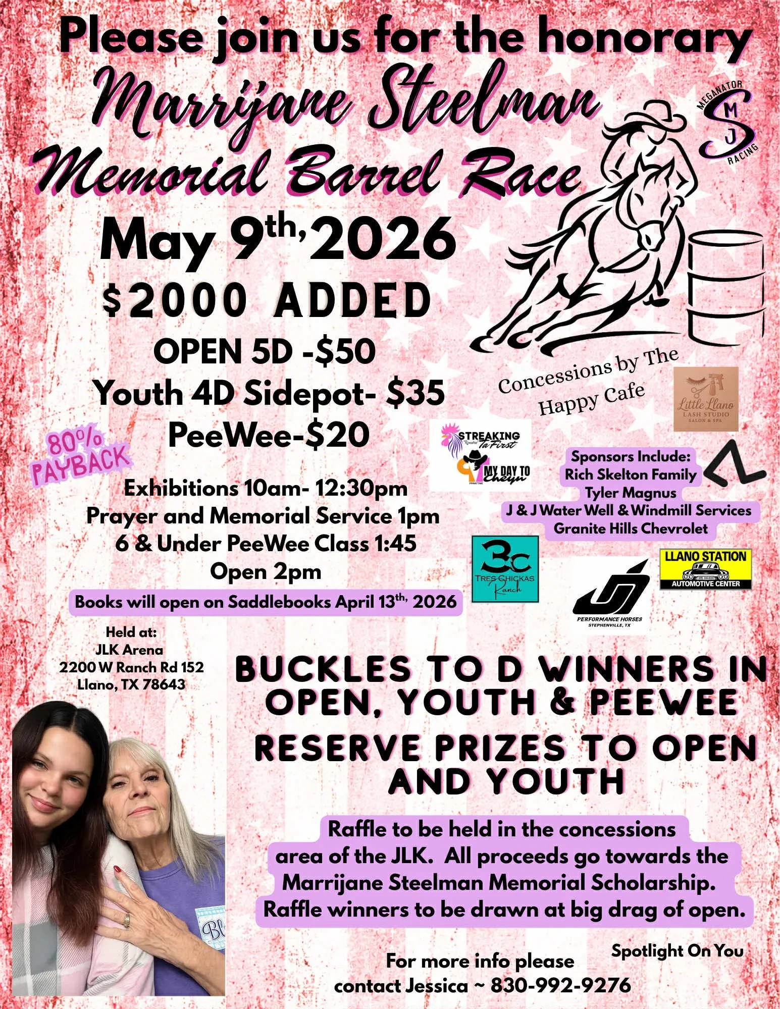 Marrijane Steelman Memorial Barrel Race at JLK Arena Saturday, May 9, 2026 10:00 AM 5:00 PM John L Kuykendall Events Center & Arena 2200 West Ranch Road 152 Llano, TX, 78643 United States (map) Google Calendar ICS John L Kuykendall