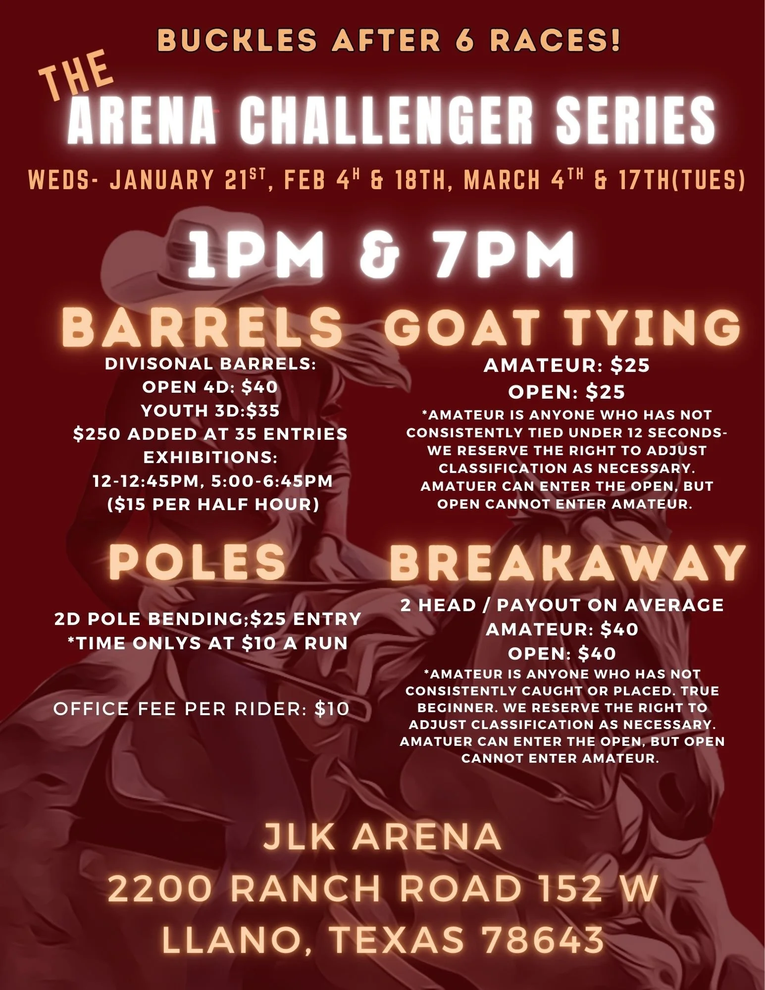 Back to All Events JLK Arena Challenge Series Tuesday, March 17, 2026 1:00 PM 9:00 PM John L Kuykendall Events Center & Arena 2200 West Ranch Road 152 Llano, TX, 78643 United States (map) Google Calendar ICS John L Kuykendall