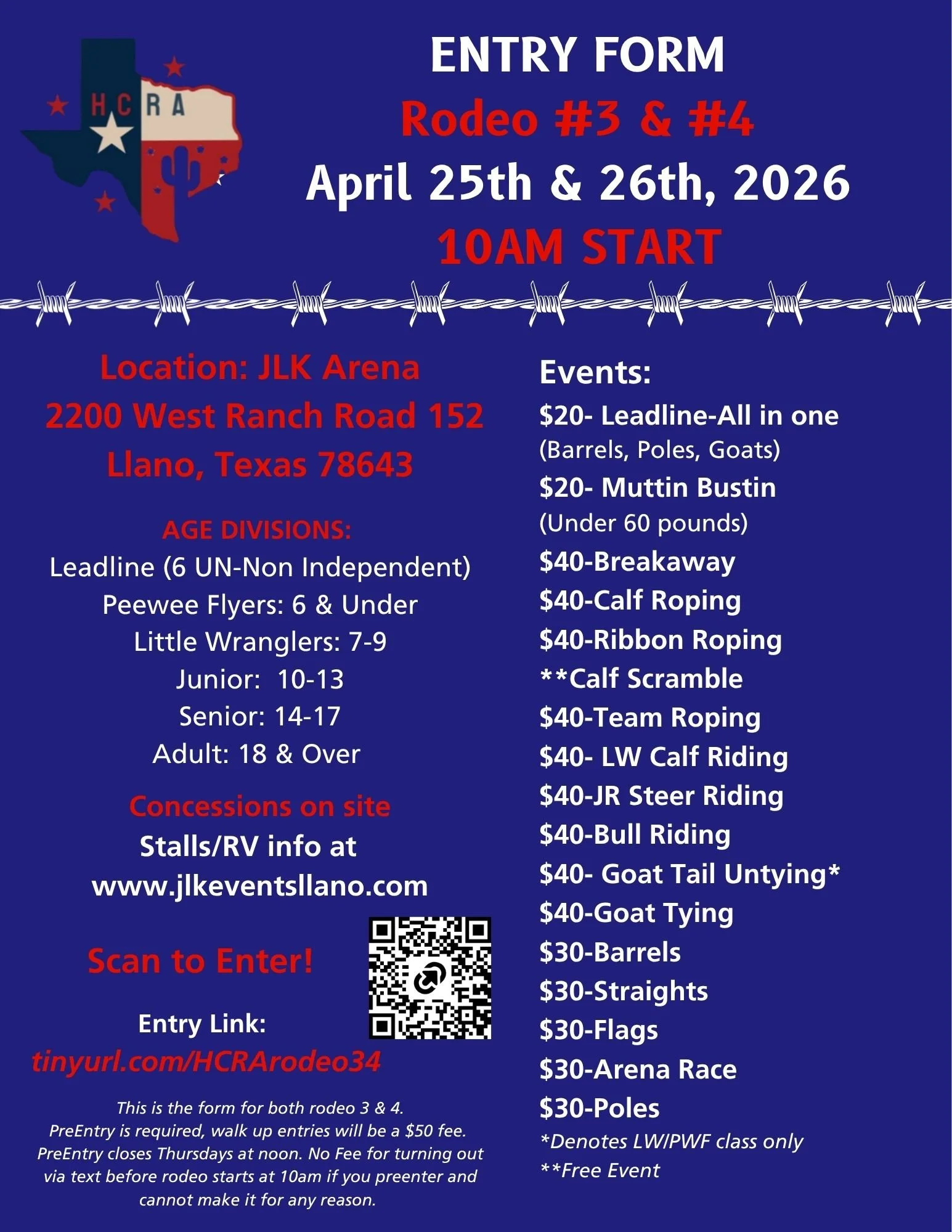 HCRA Rodeo #3 & 4 at JLK Saturday, April 25, 2026 10:00 AM Sunday, April 26, 2026 5:00 PM John L Kuykendall Events Center & Arena 2200 West Ranch Road 152 Llano, TX, 78643 United States (map) Google Calendar ICS John L Kuykendall
