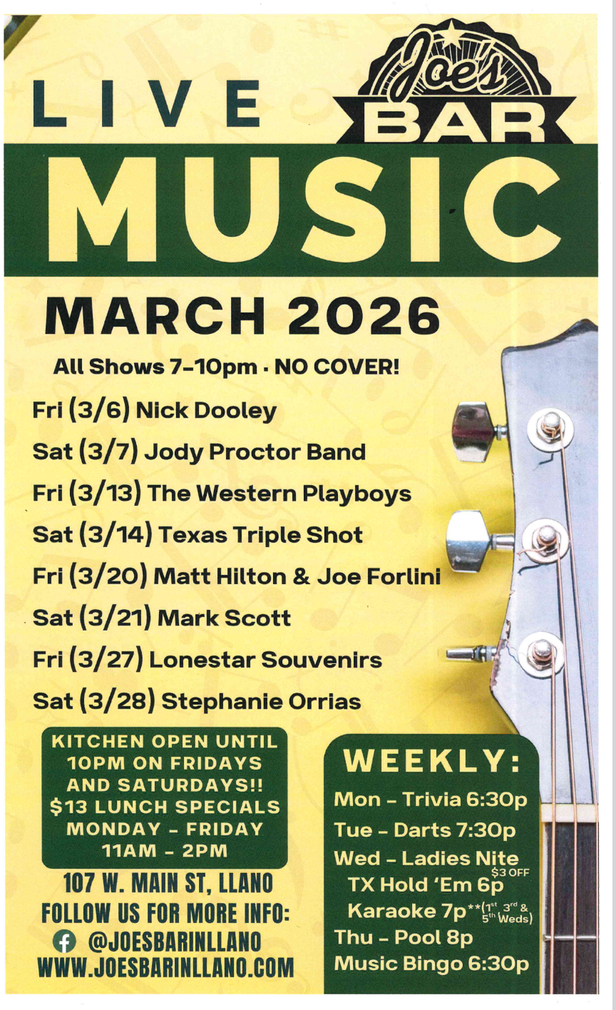 Stephanie Orrias at Joe's Bar in Llano Saturday, March 28, 2026 7:00 PM 10:00 PM Joe's Bar in Llano 107 West Main Street Llano, TX, 78643 United States (map) Google Calendar ICS Joe’s Bar in Llano