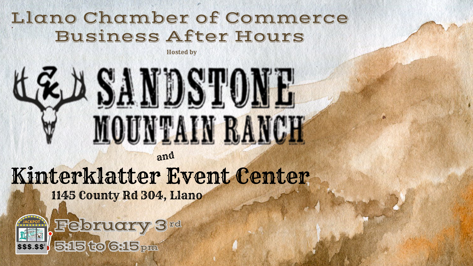 Everyone is invited to the Business After Hours event at Sandstone Mountain Ranch & Kinterklatter Event Center on February 3rd from 5:15 to 6:15 PM, located at 1145 County Road 304 Llano.