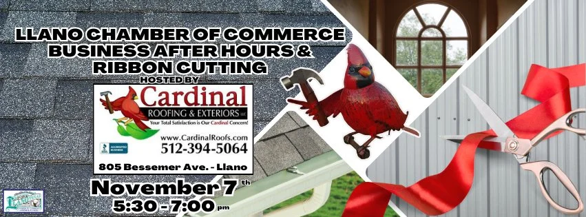 The Llano Chamber of Commerce is excited to announce a Business After Hours and Ribbon Cutting event hosted by Cardinal Roofing & Exteriors. Join us at their new location, 805 Bessemer Ave. Llano, on November 7th from 5:30 to 7:00pm. Everyone is welcome to attend this event, which offers a fantastic opportunity to connect with fellow business owners and expand your network within the community.