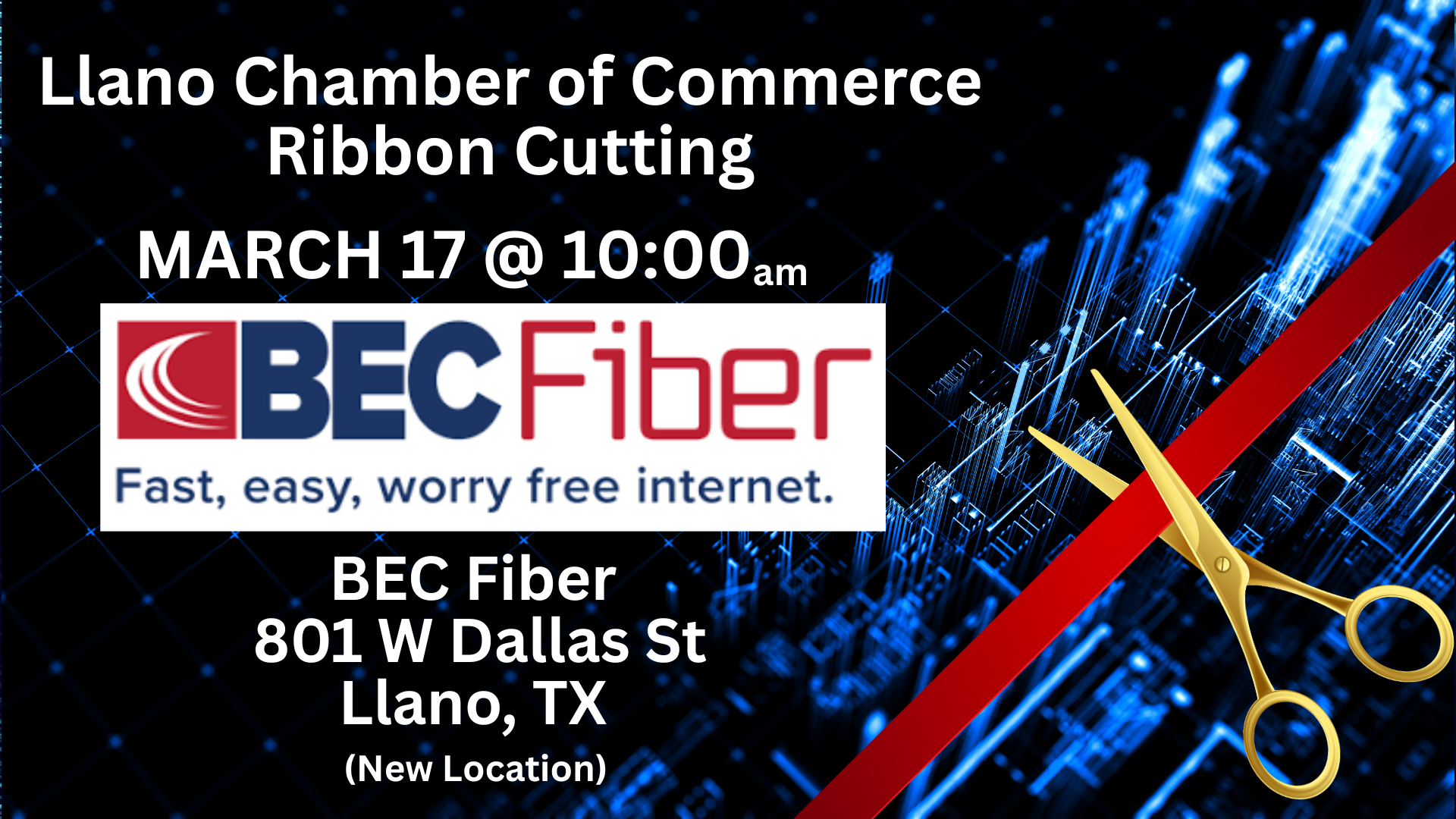 Please join us for a Llano Chamber of Commerce ribbon Cutting for BEC Fibers new location at 801 W Dallas St on March 17 at 10:00am.