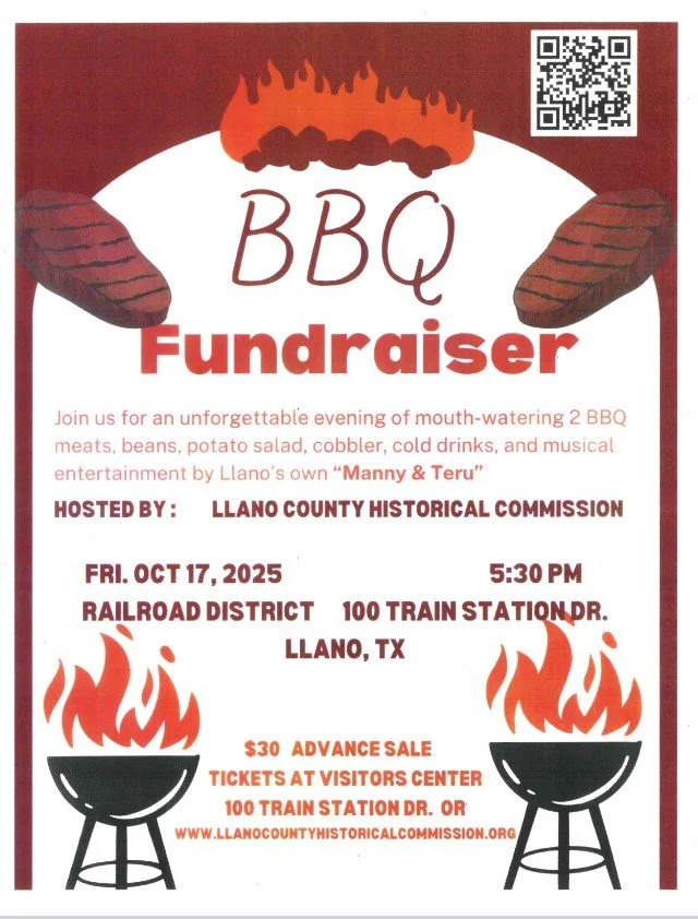 Llano County Historical Commission BBQ Fundraiser Friday, October 17, 2025 5:30 PM 7:30 PM Llano Railroad District 100 Train Station Drive Llano, TX, 78643 United States (map) Google Calendar ICS Buy Tickets
