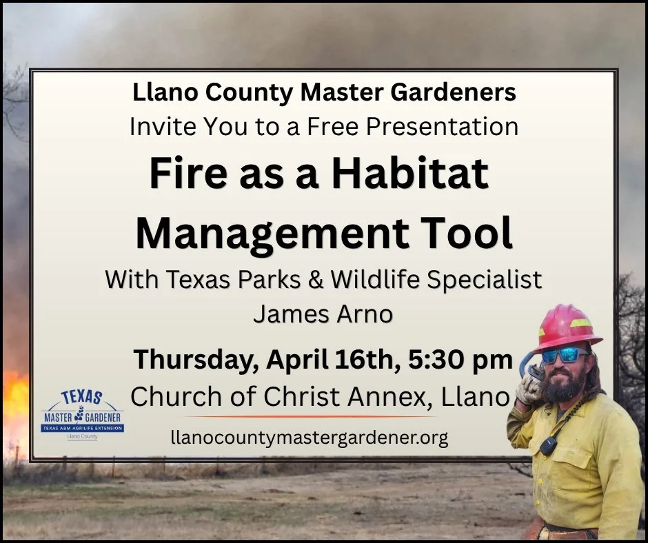 Mark your calendar. This is going to be great. James Arno, Fire & Habitat Specialist with Texas Parks and Wildlife will tell us all about prescribed fire and also defensible space, protecting your home from wildfire.