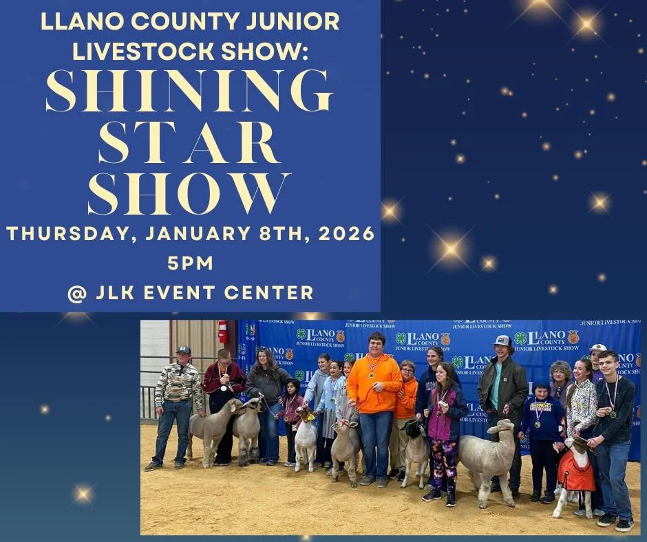Llano County Stock Show - Shining Star Show - Little Britches Show Monday, January 5, 2026 4:00 PM Friday, January 9, 2026 5:00 PM John L Kuykendall Events Center & Arena 2200 West Ranch Road 152 Llano, TX, 78643 United States (map) Google Calendar ICS
