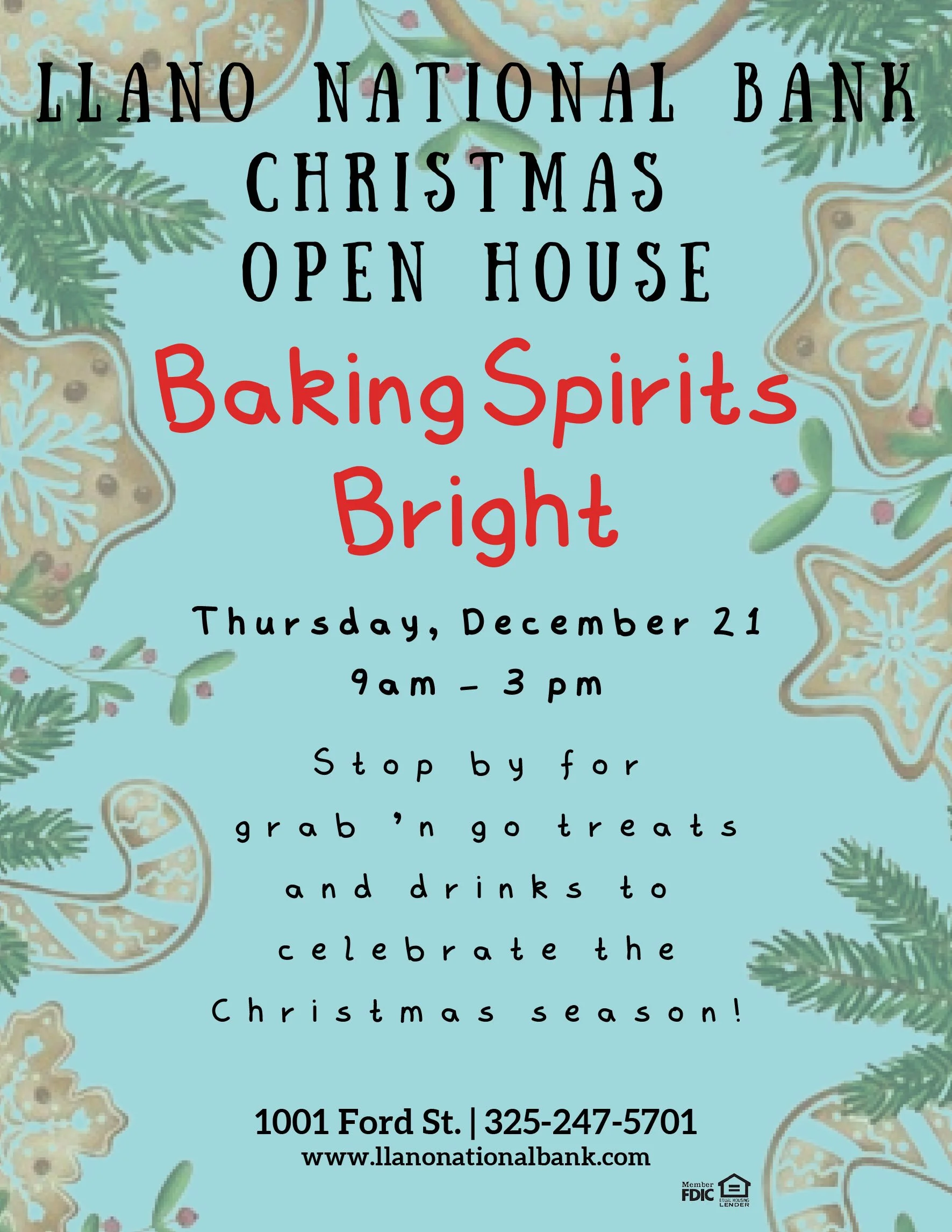Llano National Bank Christmas Open House Thursday, December 21, 2023 9:00 AM 3:00 PM Llano National Bank 1001 Ford Street Llano, TX, 78643 United States (map) Google Calendar ICS
