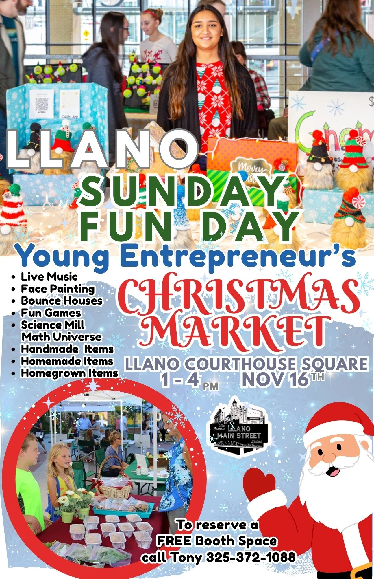 Back to All Events Llano Sunday Fun Day Young Entrepreneur Christmas Market Sunday, November 16, 2025 1:00 PM 4:00 PM Llano Courthouse Square 801 Ford Street Llano, TX, 78643 United States (map) Google Calendar ICS