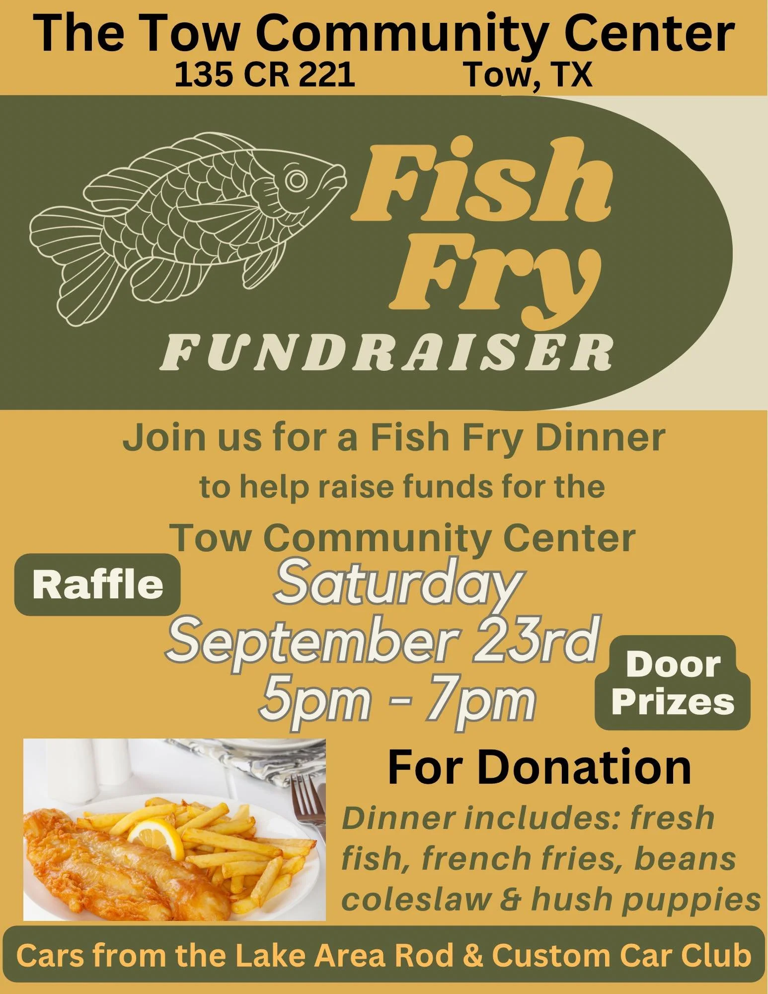 Tow Community Center- Fish Fry Saturday, September 23, 2023 5:00 PM 7:00 PM Tow Community Center 135 County Road 221 Tow, TX, 78672 United States (map) Google Calendar ICS The Official Tow Community Center