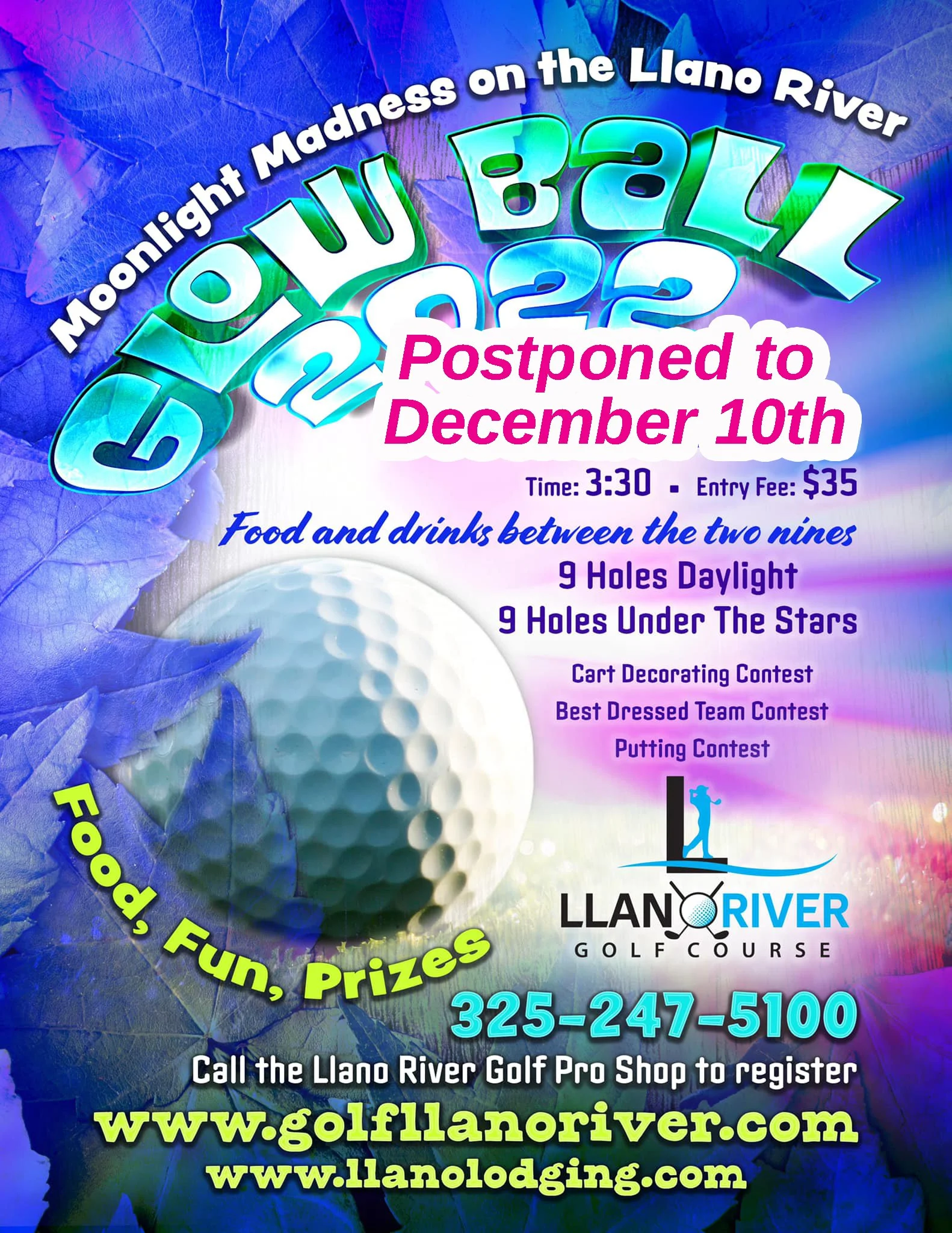 Back to All Events POSTPONED to Dec 10th Moonlight Madness on the Llano River - Glow Ball 2022 Saturday, November 19, 2022 3:30 PM 8:00 PM Llano Golf Course 2835 West Ranch Road 152 Llano, TX, 78643 United States (map) Google Calendar ICS