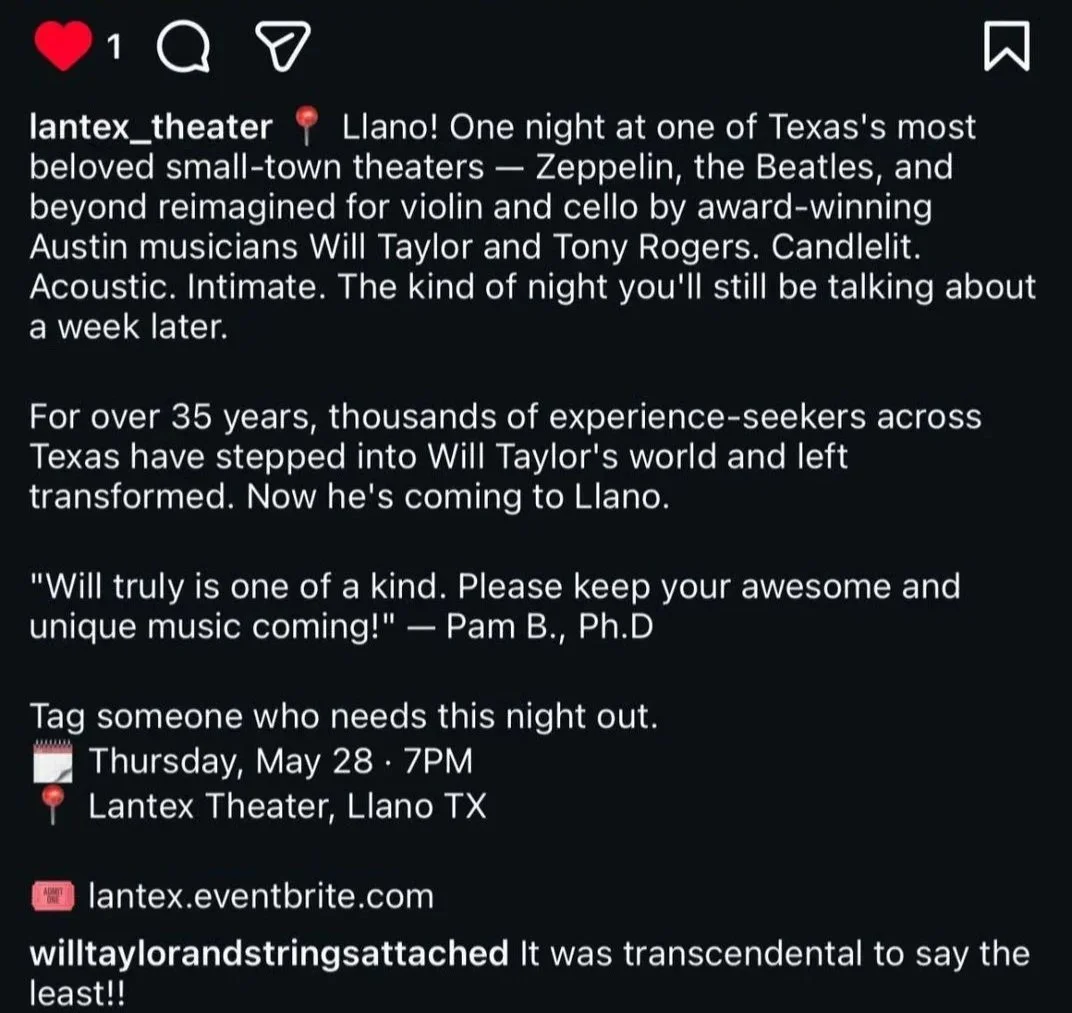 Back to All Events Will Taylor & Stirngs Attached at the Lantex Theater Thursday, May 28, 2026 7:00 PM 8:30 PM Lantex Theater 113 W Mian St Llano Llano, TX, 78643 United States (map) Google Calendar ICS Lantex Theater Get Tickets