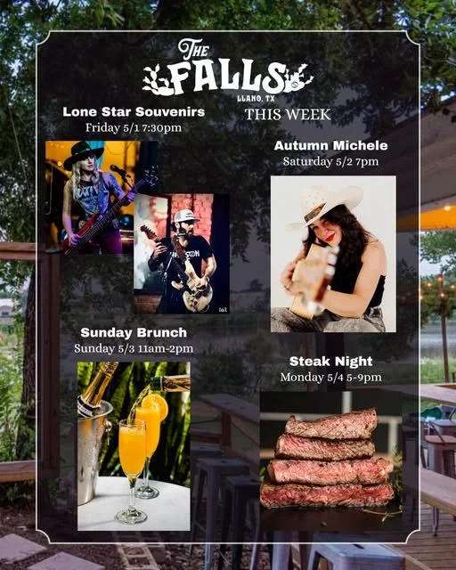 Autumn Michele at The Falls Saturday, May 2, 2026 7:00 PM 10:00 PM The Falls 301 Bessemer Avenue Llano, TX, 78643 United States (map) Google Calendar ICS The Falls