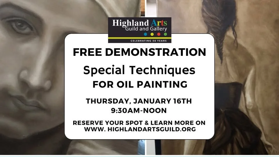 Join us at the Highland Arts Guild & Gallery on Thursday, January 16th, 2025, from 9:30AM AM to 12 PM, for an inspiring free demonstration on Special Techniques for Oil Painting. The Instructor will demonstrate the techniques of Wipe Out and Grisaille in oil painting.