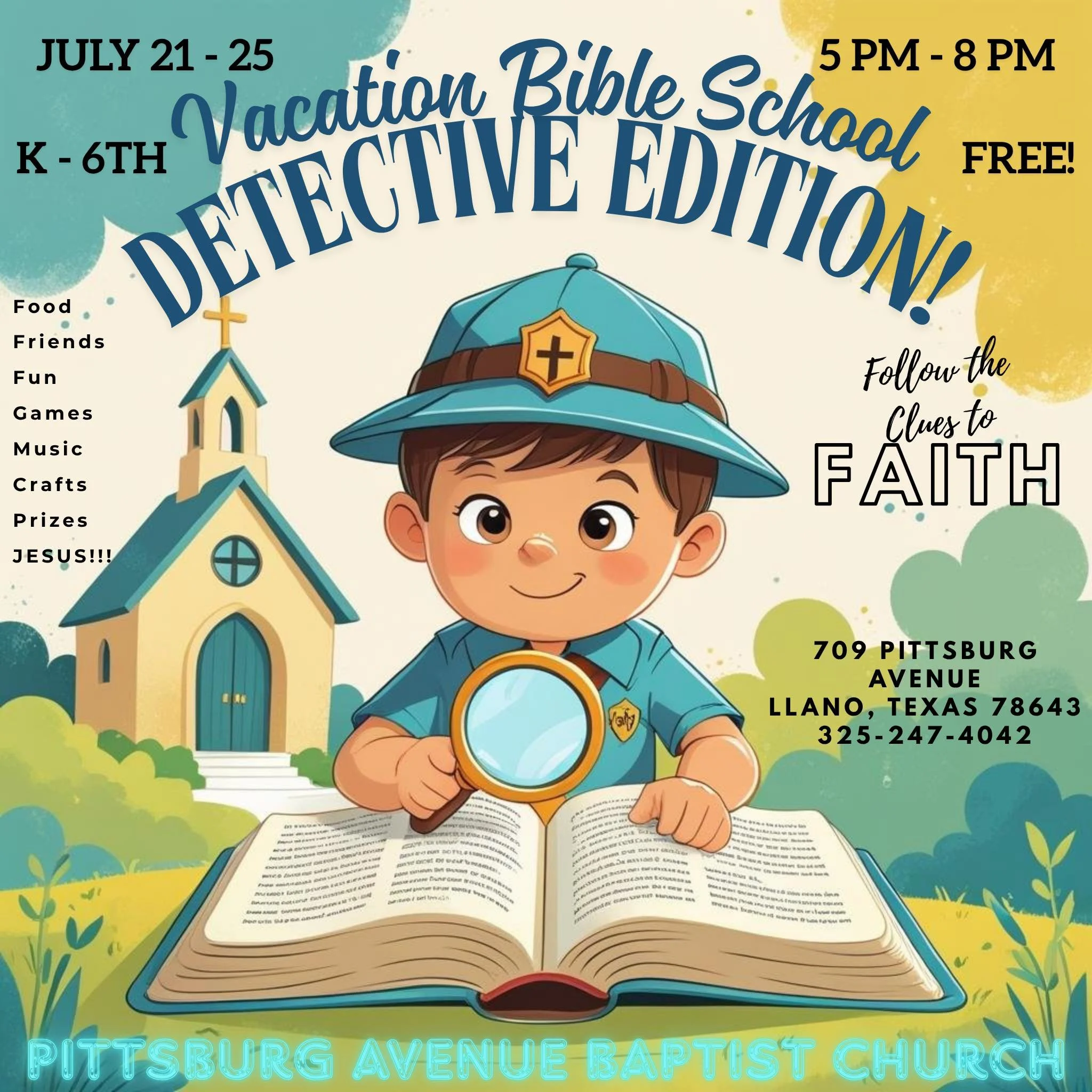 Pittsburg Avenue Baptist Church Vacation Bible School Monday, July 21, 2025 5:00 PM Friday, July 25, 2025 8:00 PM Pittsburg Avenue Baptist Church 709 Pittsburg Ave Llano, TX, 78643 United States (map) Google Calendar ICS