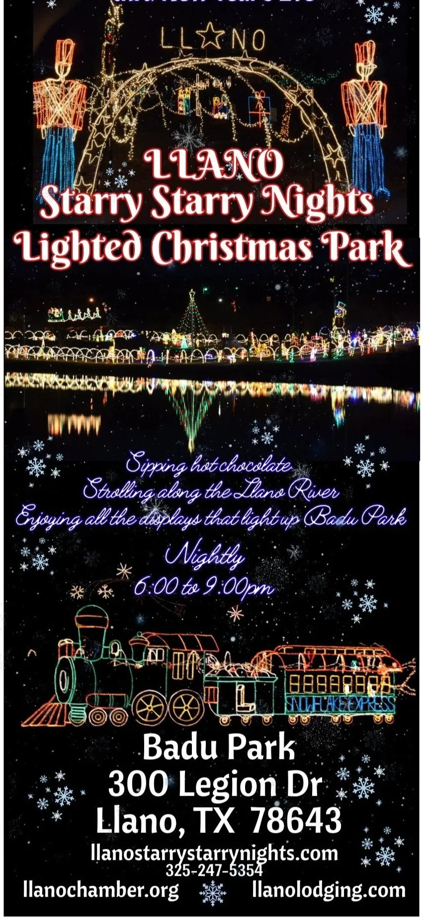 Back to All Events Starry Starry Nights Lighted Christmas Park Saturday, December 6, 2025 6:00 PM Wednesday, December 31, 2025 9:00 PM Badu Park 300 Legion Dr 78643 US (map) Google Calendar ICS