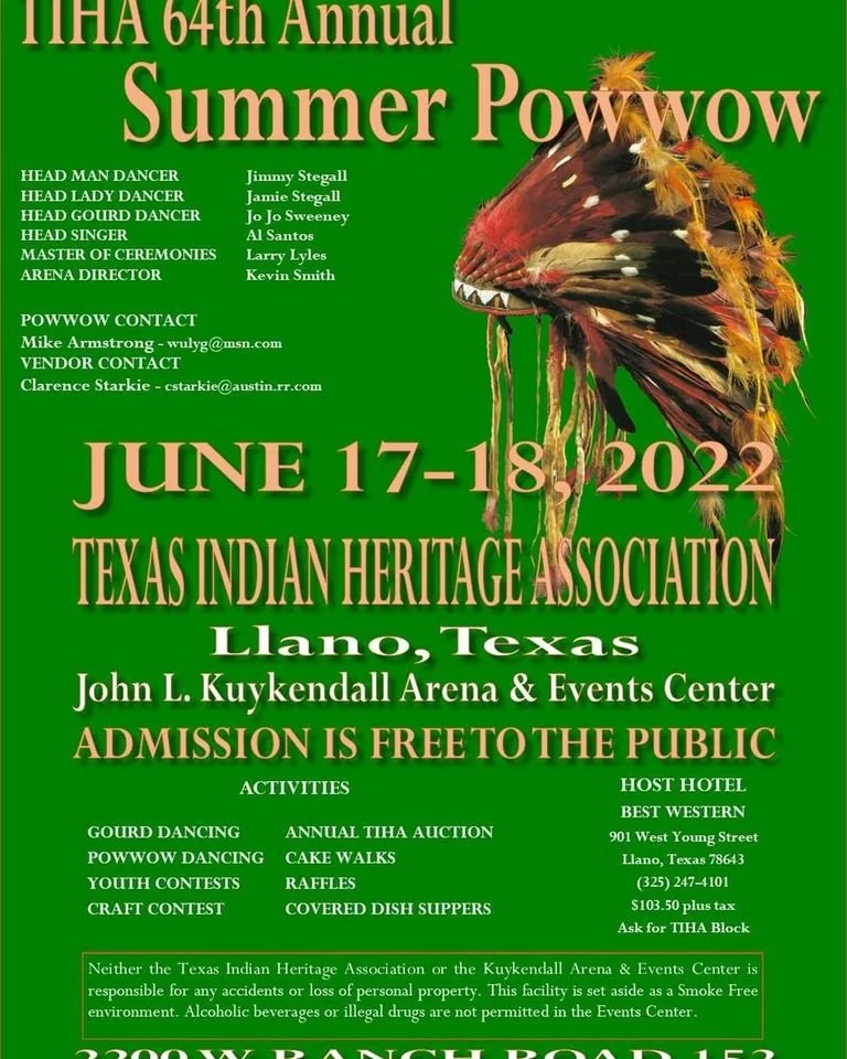 Texas Indian Heritage Association - TIHA - Summer Powwow Friday, June 17, 2022 3:30 PM Saturday, June 18, 2022 8:00 PM John L Kuykendall Event Center & Arena 2200 West Ranch Road 152 Llano, TX, 78643 United States (map) Google Calendar ICS Texas Indian Heritage Association - TIHA