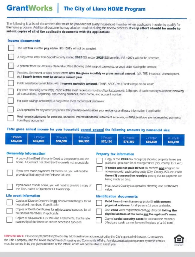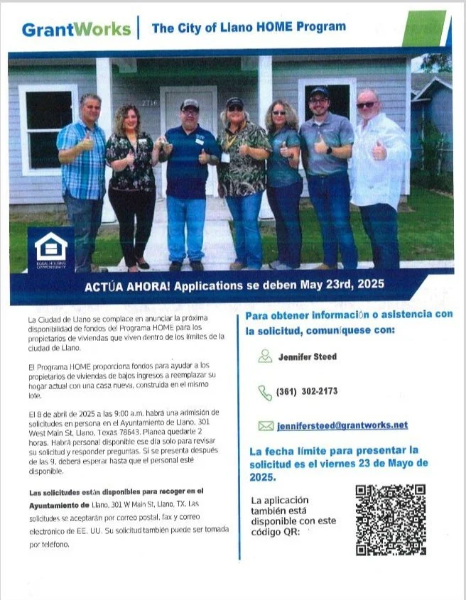 Grant Works - The City of Llano Home Program Tuesday, April 8, 2025 9:00 AM 5:00 PM Llano City Hall 301 West Main Street Llano, TX, 78643 United States (map) Google Calendar ICS