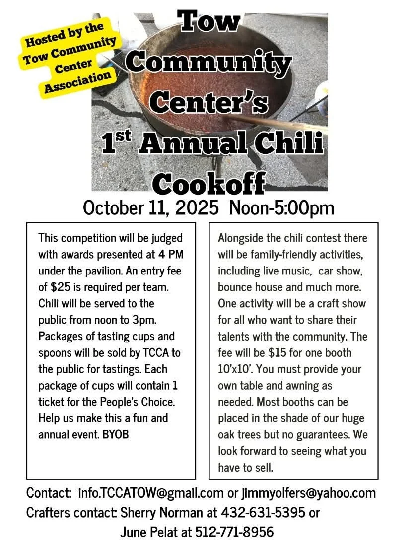 SAVE THE DATE! It's official! Our 1st Annual Chili Cookoff hosted by the Tow Community Center Association. Saturday, October 11, 2025 from noon-5pm