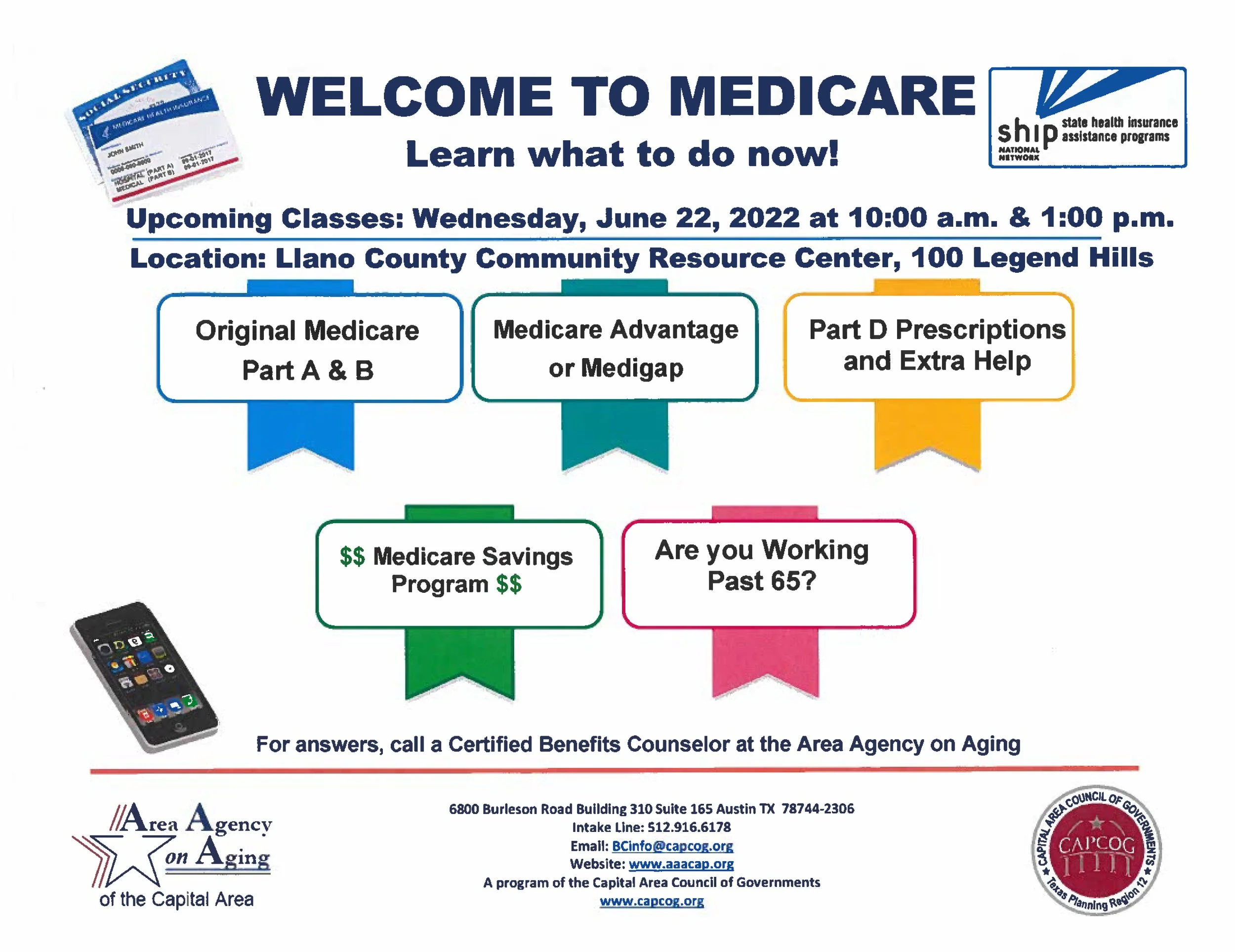 Back to All Events Welcome to Medicare Class Wednesday, June 22, 2022 10:00 AM 12:00 PM Llano County Community Resource Center 100 Legend Hills Boulevard Llano, TX, 78643 United States (map) Google Calendar ICS Area Agency on Aging