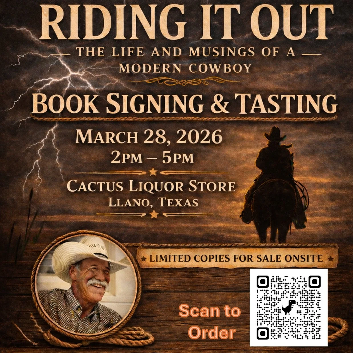 Book Signing & Tasting at Cactus Liquor Saturday, March 28, 2026 2:00 PM 5:00 PM Cactus Liquor 506 East Young Street Llano, TX, 78643 United States (map) Google Calendar ICS Mark your calendar for March 28 between 2 and 5 PM! Come on out to support this ole Llano cowboy! Limited copies will be available or scan the QR code to purchase your book before hand.