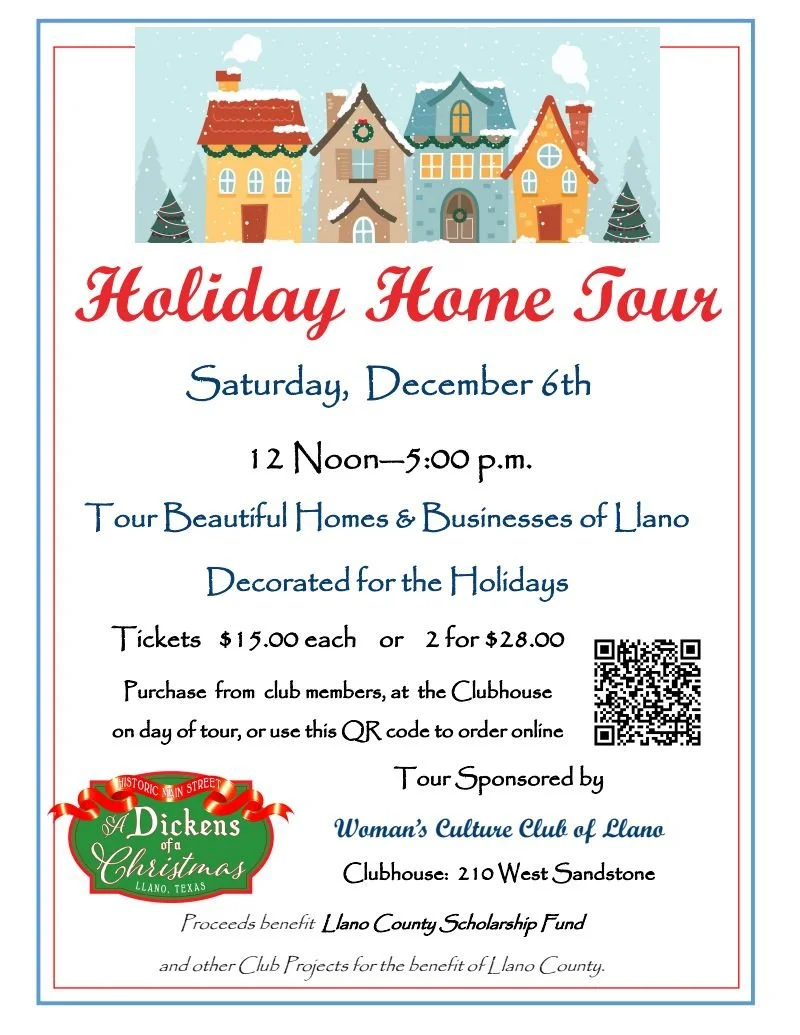 Back to All Events Woman's Culture Club of Llano Holiday Home Tour Saturday, December 6, 2025 12:00 PM 5:00 PM Woman's Culture Club Clubhouse 210 West Sandstone Street Llano, TX, 78643 United States (map) Google Calendar ICS